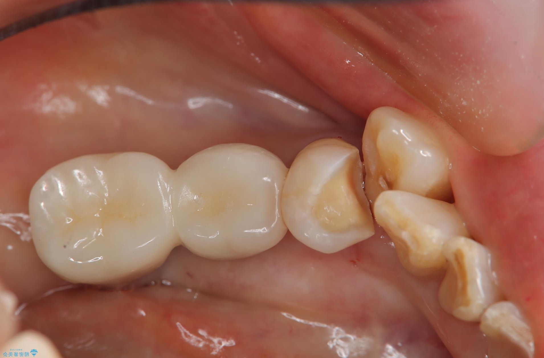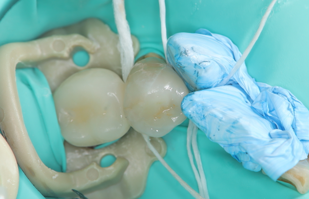 歯並びの複雑な箇所では、通常のプラスチック(レジン)の詰め物でぴったり正確な形を再現するのは困難です。そこで今回は、シリコンで精密な型を採り、その型をもとに精巧なセラミックインレーを作製して治療を行いました。術後にフロスがしっかりと通せるように、ラバーダム防湿を行っています。