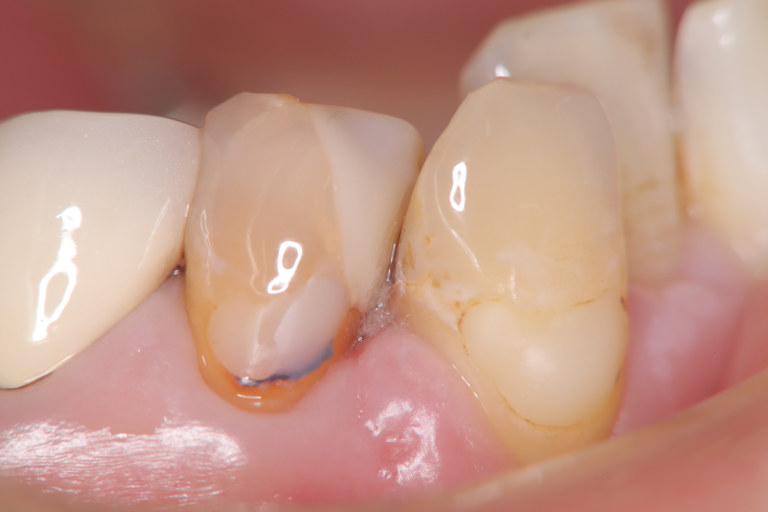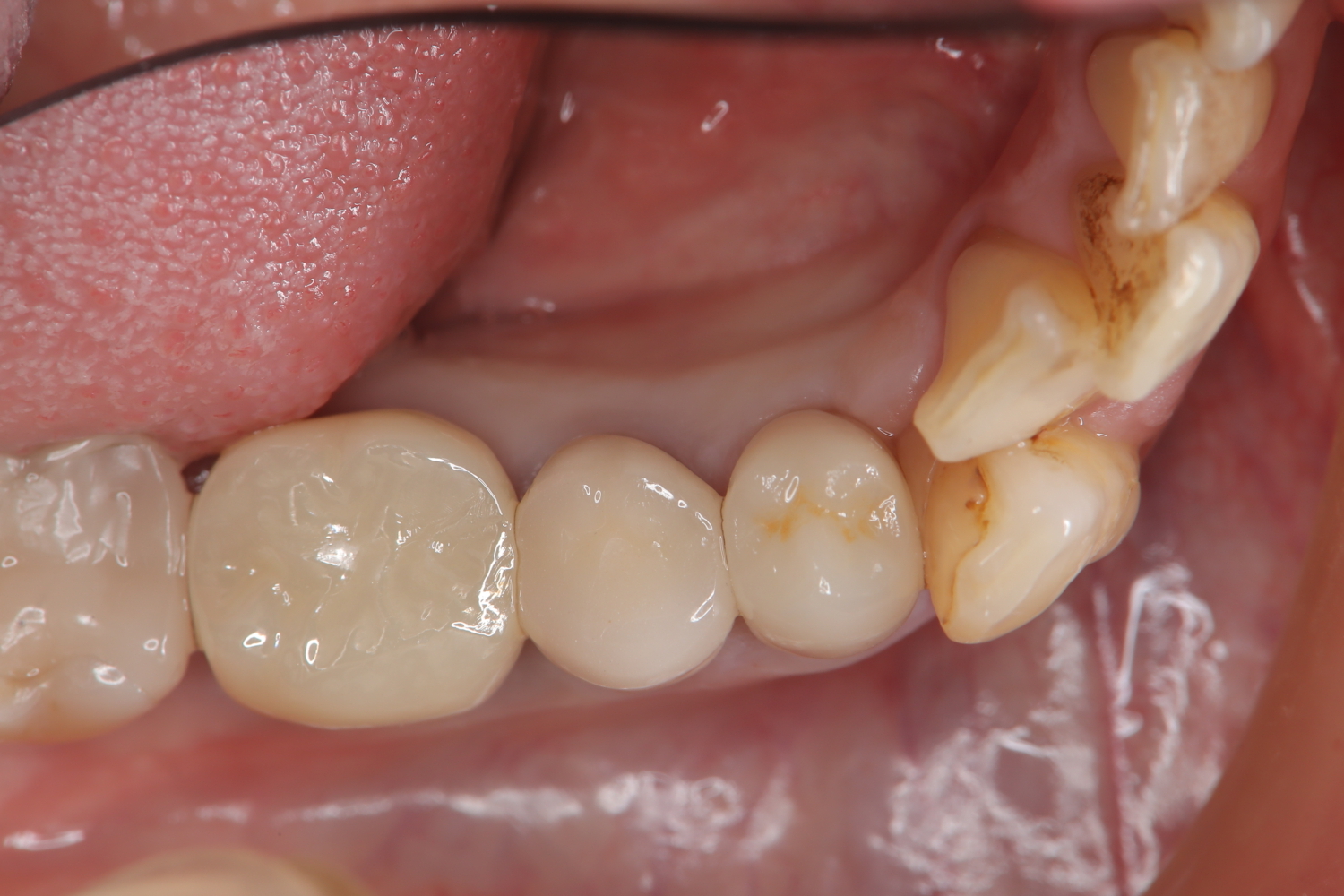 以前他院で治療された部分に凹みがあり、そこにフロスが引っかかってちぎれるという問題が生じていました。この根本的な原因を解決するため、被せ物・詰め物を新しく作り直す治療を提案・実施しました。